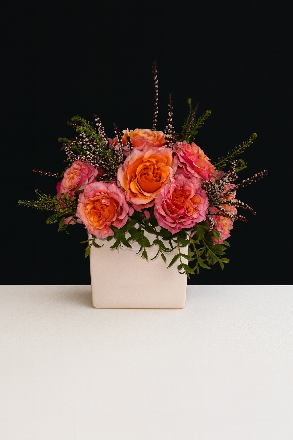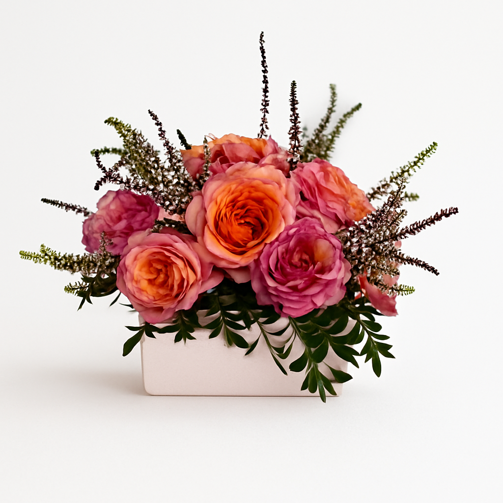 Soft yet striking, Bella shines with lush garden roses in warm shades of pink, coral, and orange. Delicate sprigs of heather and fresh greenery add texture and charm, all arranged in a modern white vase. Radiant and playful, Bella is the perfect touch of romance and elegance for any space.