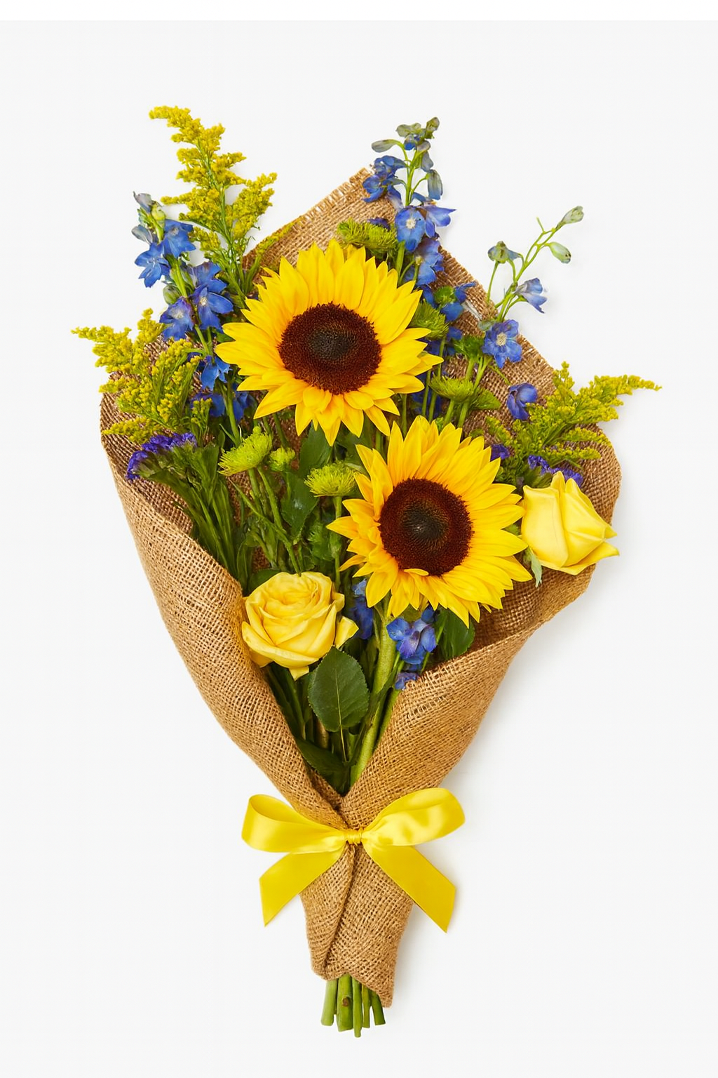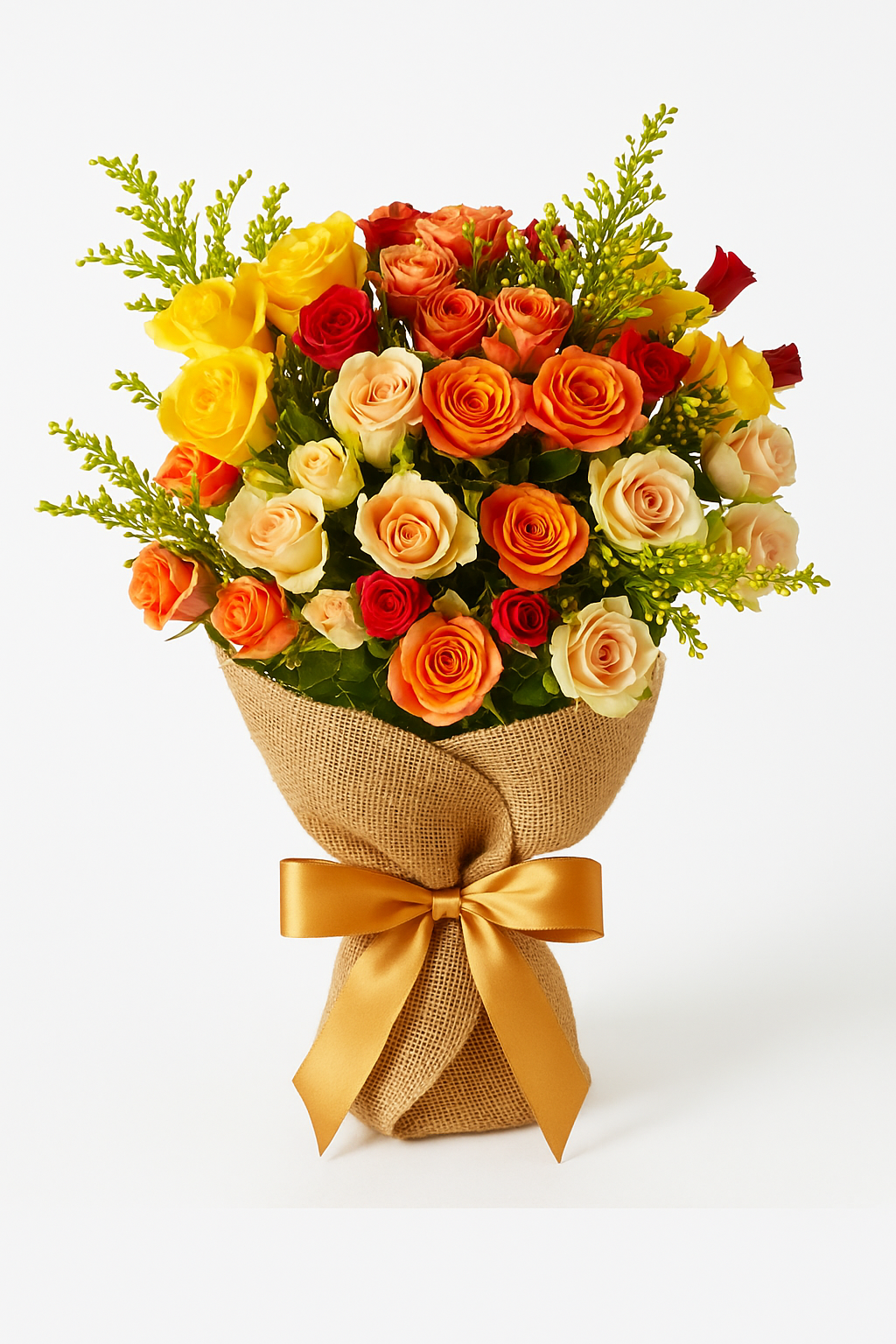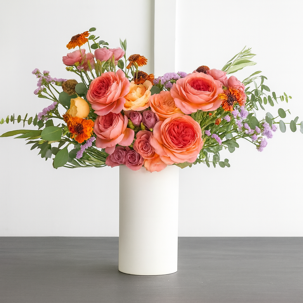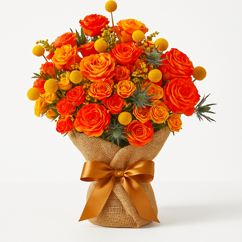 A vibrant ode to fall, Rosé Radiance features bold fuchsia roses, soft peach ranunculus, and playful pink carnations, accented with deep burgundy blooms and golden calla lilies. Wrapped in rustic burlap and finished with a satin ribbon in the same radiant rose tone, this bouquet captures the warmth and richness of the season.